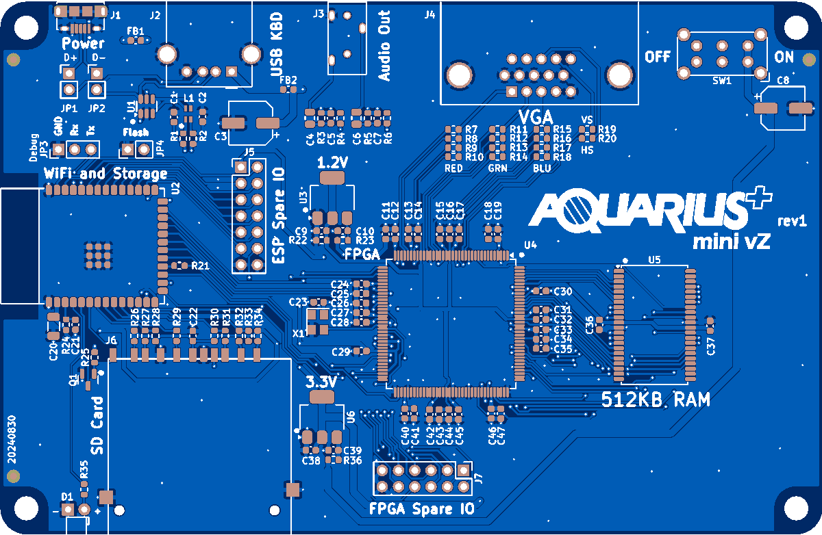 Aquarius+ Mini rev1 (vZ) PCB — это современный ребут легендарного компьютера Mattel Aquarius, выполненный как компактная плата‑материнка на основе FPGA (виртуальный Z80) . Основные особенности: